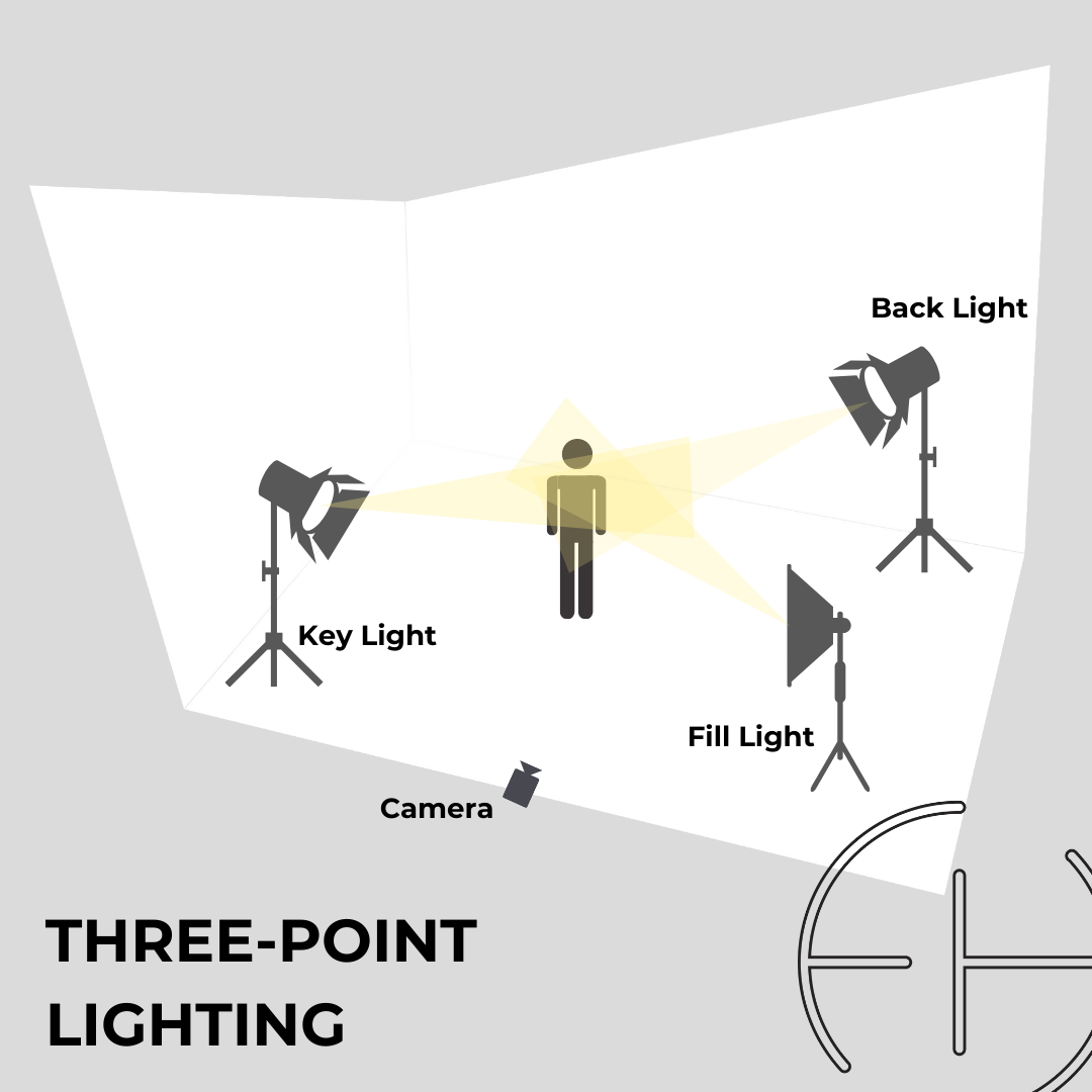 Three-point lighting is a standard method used when shooting video. Three-point lighting involves the use of a key light, a filler light, and a backlight.