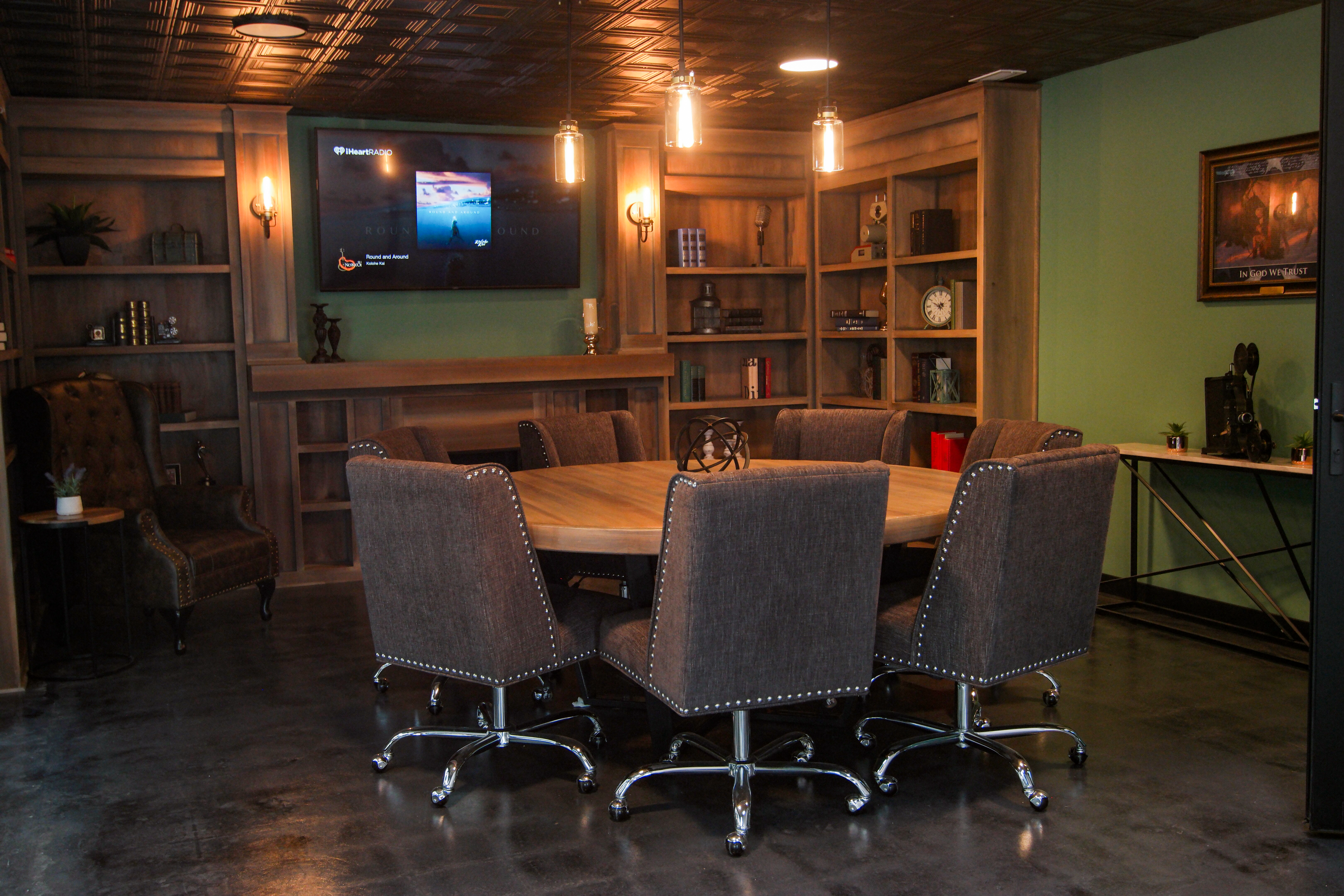 - 15′ X 20′ Round Conference Table and Chairs Seats for 8