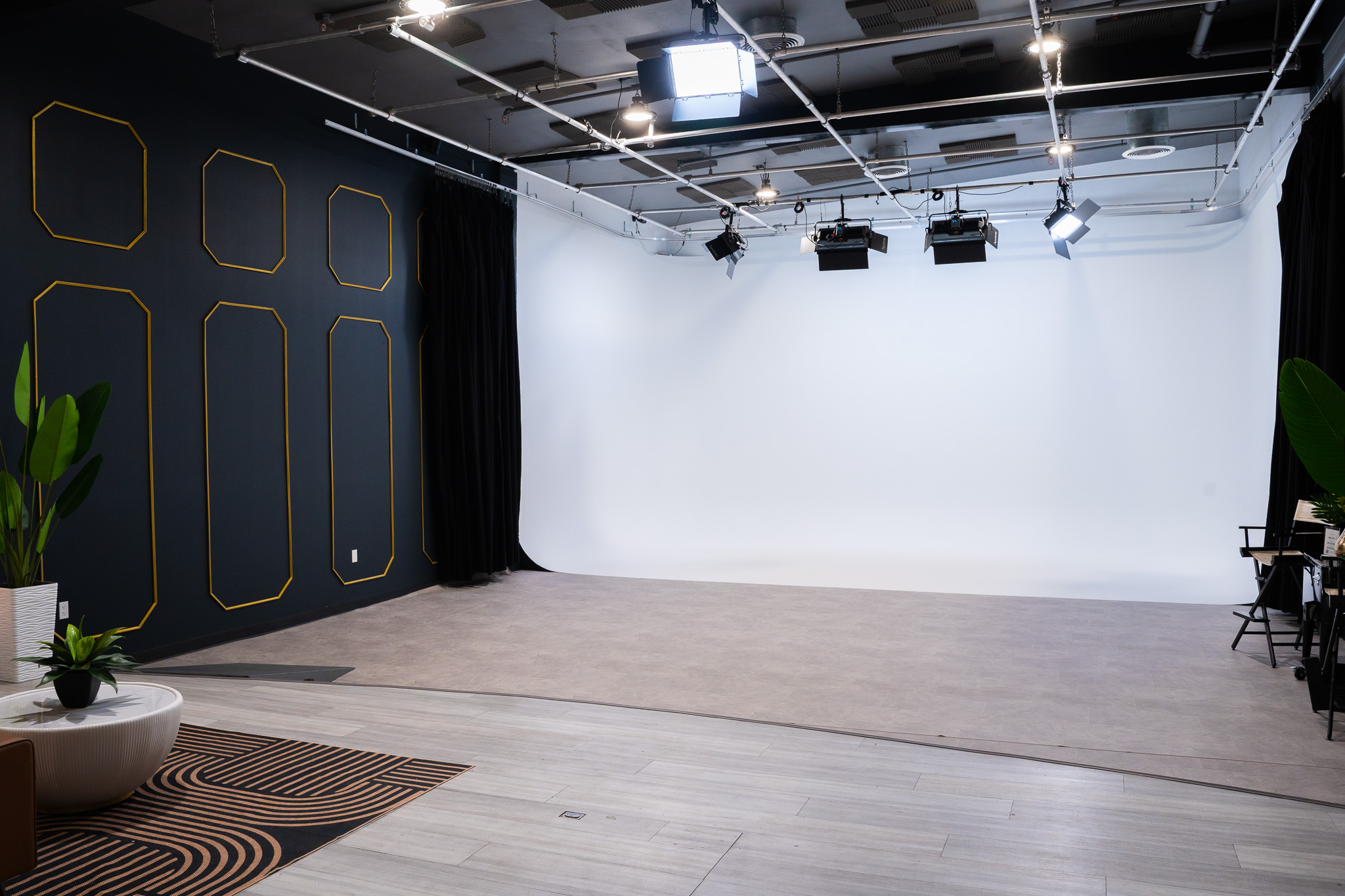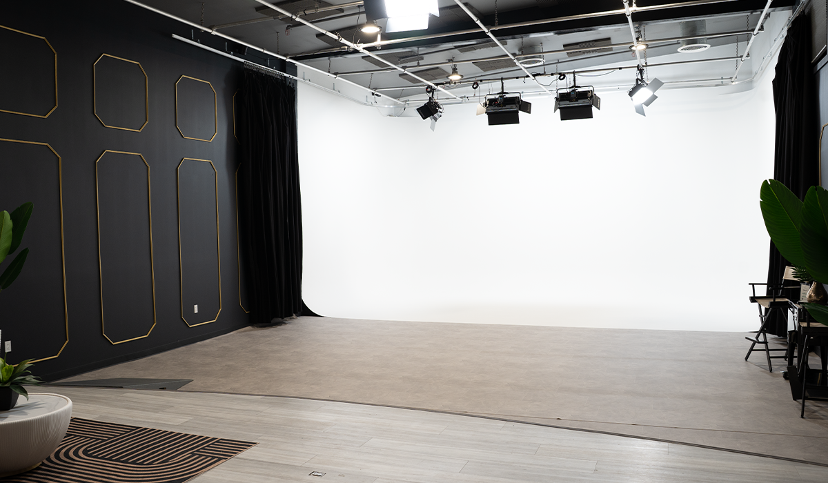50′ X 27′ Stage 2 is a fully equipped, soundproof production space designed for content creators, agencies, podcasters, and filmmakers. Located in The Film Hub