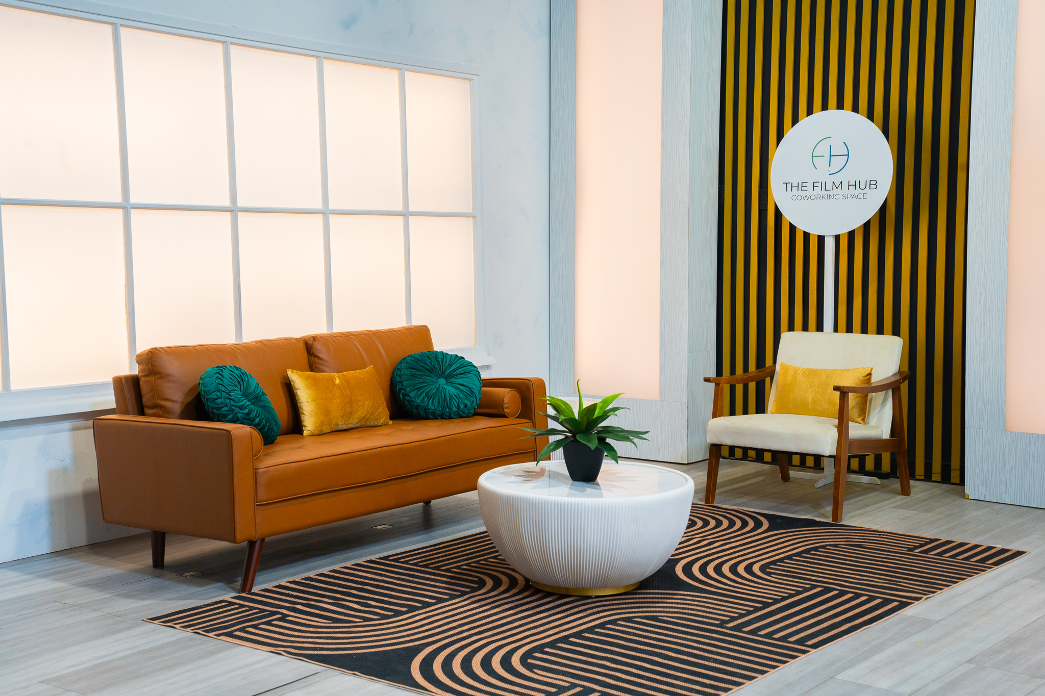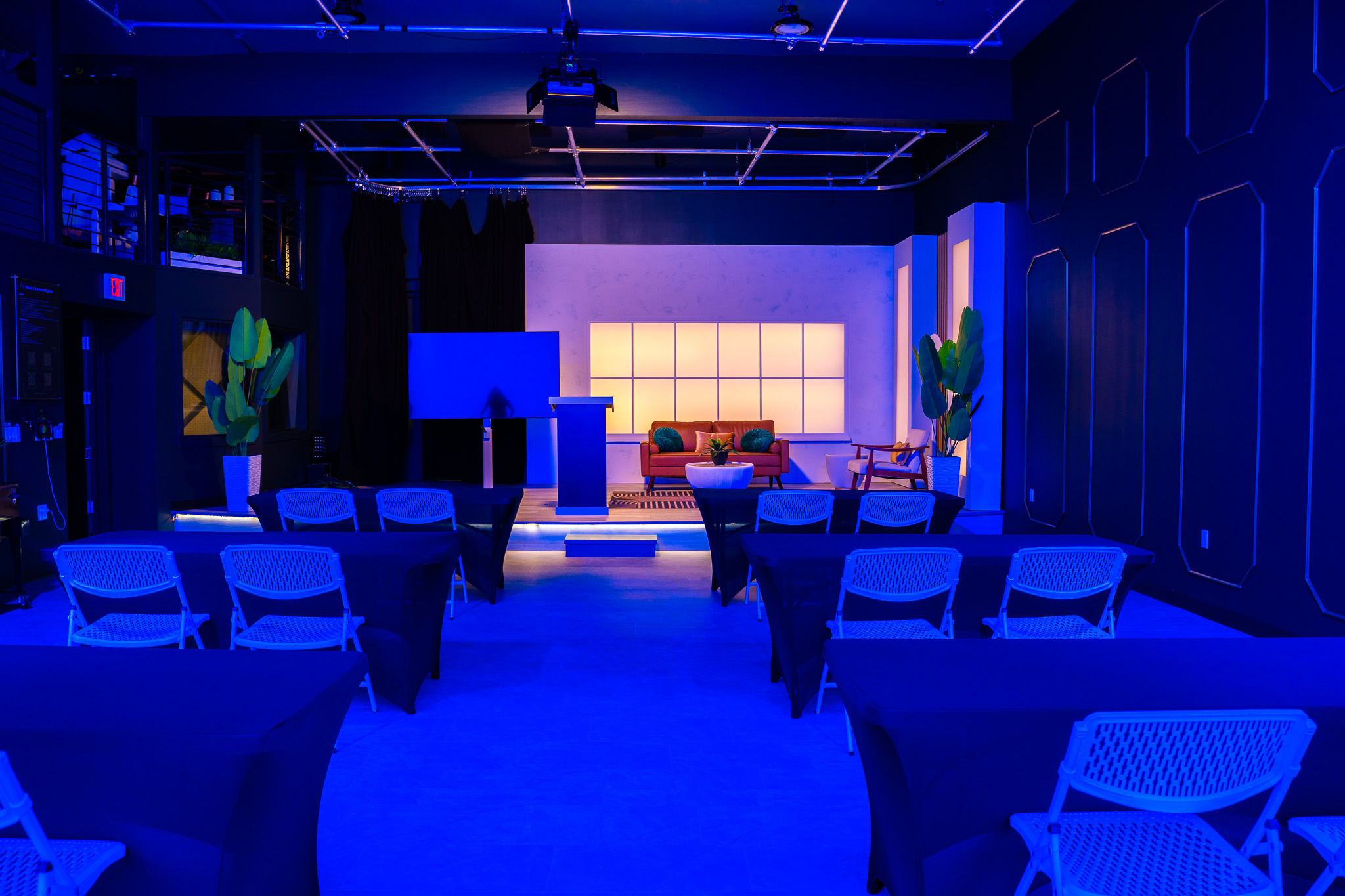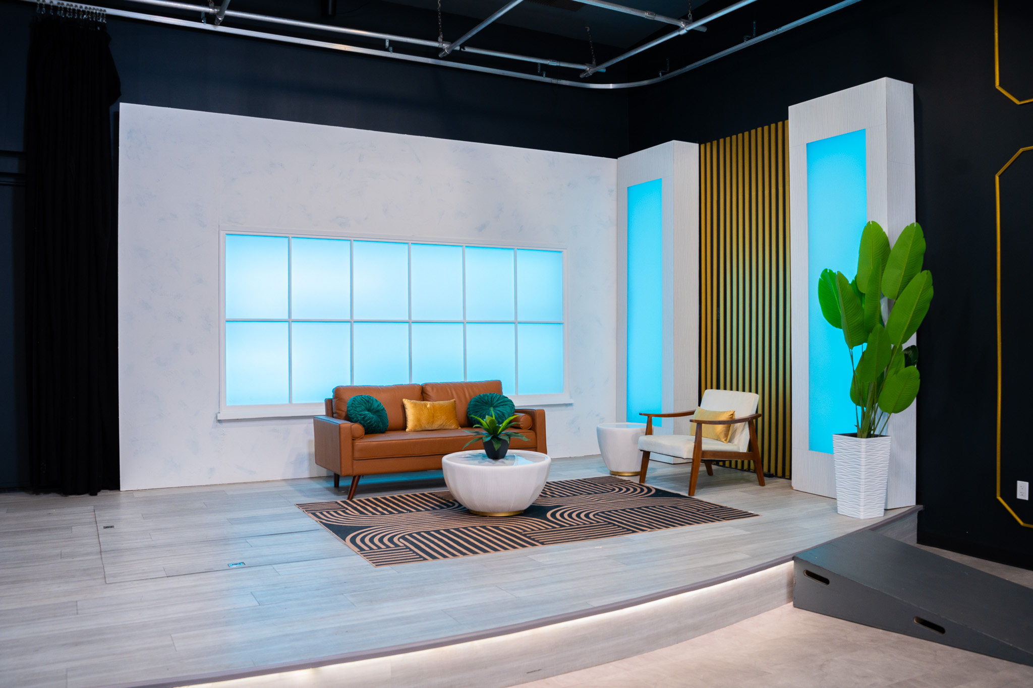 Affordable small studio space with 4 standing set options, perfect for small talk shows and interviews.